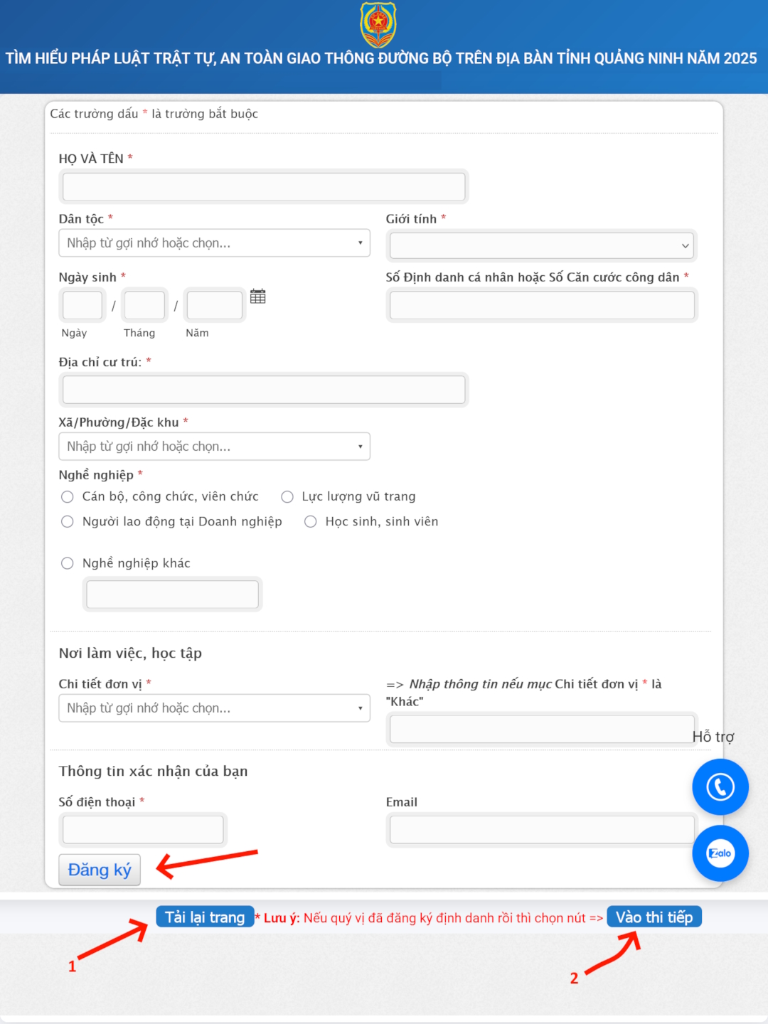 - Trường hợp quý vị nhập thông tin xong nếu click nút “Đăng ký” mà chưa được do lỗi trong quá trình thao tác thì quý vị vui lòng chọn nút “Tải lại trang” sau đó nhập lại và chọn “Đăng ký” để vào thi